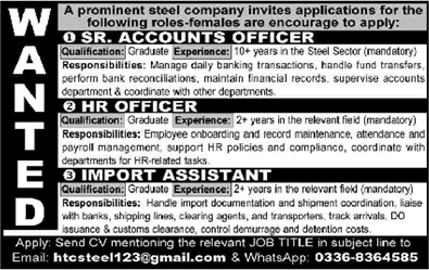 HTC Steel Karachi Jobs 2026 February Accounts Officer, HR Officer & Import Assistant