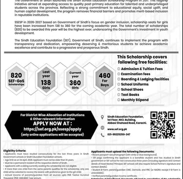 Sindh Education Foundation is offering SSESP Scholarship 2026-27 for talented Sindh Class VIII students, providing financial support to study in selected schools. Last date: 25 Feb 2026.